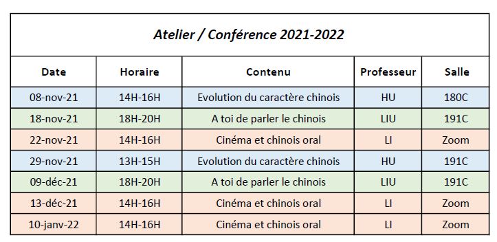 Tous les niveaux sont acceptés, pas de date limite d’inscription, ouvert à tous, atelier gratuit, cours assuré par Mme LIU Ruojing.