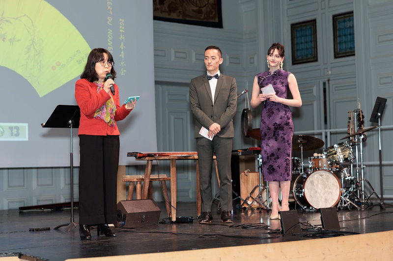 本场音乐会既是一次文化艺术盛会,也是孔子学院教学成果的集中展示。整台演出由孔院古琴教师孟令晨策划与编导,中法双语主持由孔院汉语教师梁允飞与法国学员艾莉(Elise Lelédy)共同担任。孔院学员Stella Schmiegelow在演出中担任故事讲述者。她自2024年来孔院学习中文并参与古琴与国画课程,在教师指导下逐渐深入了解中国文化,中文水平显著提升。演出中,她以流利的中文深情讲述袁晓园的故事,并在古琴伴奏下演唱琴歌《汉节操》,赢得观众热烈掌声。演出结束时,她动情地感谢孔院教师,并表示学习中文为自己的人生开启了新的方向。(图5、6)
