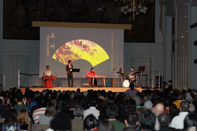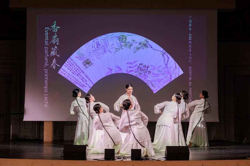 Le concert « L’Éventail du Printemps » retrace le parcours de vie de Yuan Xiaoyuan, la première femme diplomate chinoise à avoir étudié en France. À travers des formes artistiques variées — musique instrumentale chinoise et occidentale, danse, chant — l’œuvre raconte une histoire d’attachement à la patrie et d’amitié franco-chinoise traversant un siècle. Utilisant « l’éventail plié » comme fil conducteur narratif, le spectacle illustre le cheminement de Yuan Xiaoyuan, depuis son enfance dans une famille lettrée du Jiangnan jusqu’à la scène mondiale : jeune, elle part étudier en France pour poursuivre ses idéaux ; dans les moments critiques pour la nation, elle mobilise les communautés chinoises à l’étranger ; après ses études, elle s’engage dans la carrière diplomatique et contribue activement à la modernisation des caractères chinois ainsi qu’à la diffusion de la culture chinoise. Les interprètes, grâce à leur solide maîtrise technique et leur riche créativité, ont insufflé une nouvelle vie au guqin millénaire, au saxophone et aux percussions occidentales. Les images d’archives se mêlant à la narration scénique, la singularité artistique de la performance a profondément ému le public. (Images 3 et 4)