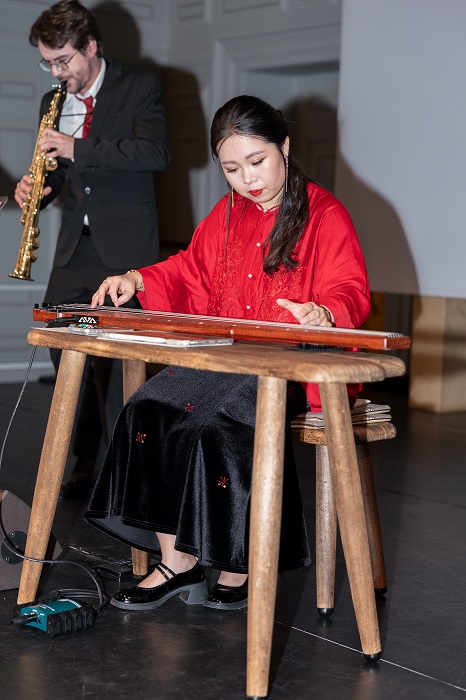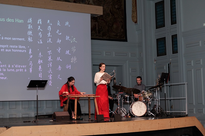 Ce concert n’était pas seulement un événement culturel et artistique, mais aussi une vitrine des résultats pédagogiques de l’Institut Confucius. L’ensemble du spectacle a été conçu et mis en scène par Meng Lingchen, professeur de guqin à l’Institut. La présentation bilingue franco-chinoise a été assurée par Liang Yunfei, enseignant de chinois à l’Institut, et Élise Lelédy, une apprenante française. Une autre apprenante de l’Institut, Stella Schmiegelow, a joué le rôle de la narratrice. Venue apprendre le chinois à l’Institut en 2024 et participant aux cours de guqin et de peinture chinoise, elle a, grâce aux conseils de ses professeurs, approfondi sa compréhension de la culture chinoise et considérablement amélioré son niveau de chinois. Durant le spectacle, elle a raconté avec émotion et dans un chinois courant l’histoire de Yuan Xiaoyuan, et a interprété le chant « Han jie cao » accompagnée au guqin, remportant de vifs applaudissements. À la fin de la représentation, elle a chaleureusement remercié les professeurs de l’Institut, confiant que l’apprentissage du chinois avait ouvert une nouvelle voie dans sa vie. (Images 5 et 6)