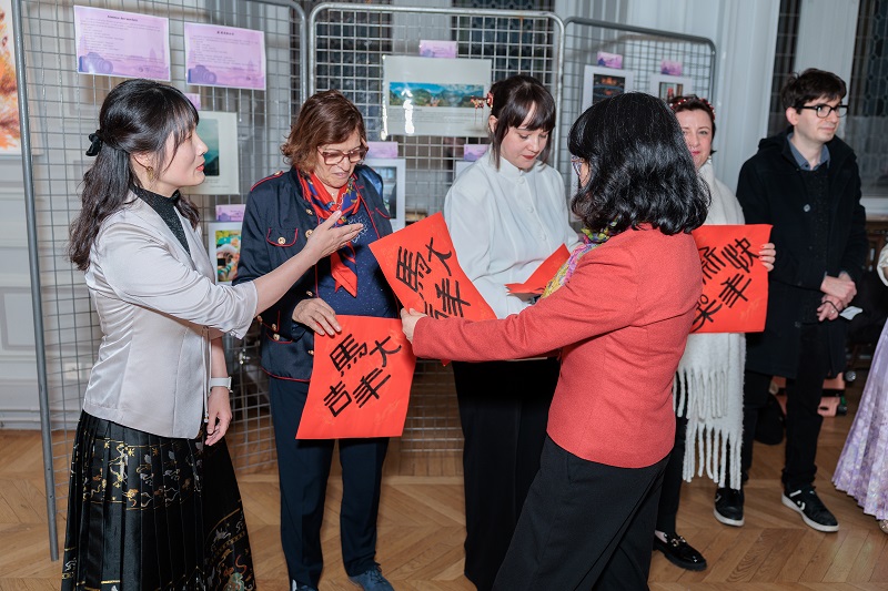 Une heure avant le concert, l’Institut a organisé dans le hall d’exposition de la Mairie du 13e la cérémonie de remise des prix du premier concours de photographie « Lumières et ombres de la Chine », ainsi que des activités culturelles pour le Nouvel An. Le concours photo a reçu 126 œuvres de plus de 20 participants, offrant un panorama de la culture et de la société chinoises vues par les apprenants. Les ateliers « Dessiner le cheval pour l’année du Cheval », « Offrir des vœux de Nouvel An » et l’estampage de sceaux ont été les activités les plus populaires, attirant de nombreux Français venus faire la queue, dans une atmosphère chaleureuse typique du Nouvel An. (Images 8, 9 et 10)