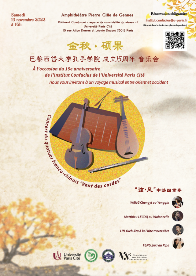 A l’occasion du 15e anniversaire de l’Institut Confucius de L’Université Paris Cité nous vous invitons (dans la limite des places disponibles) à un voyage musical entre orient et occident avec le quatuor franco-chinois : Vent des cordes