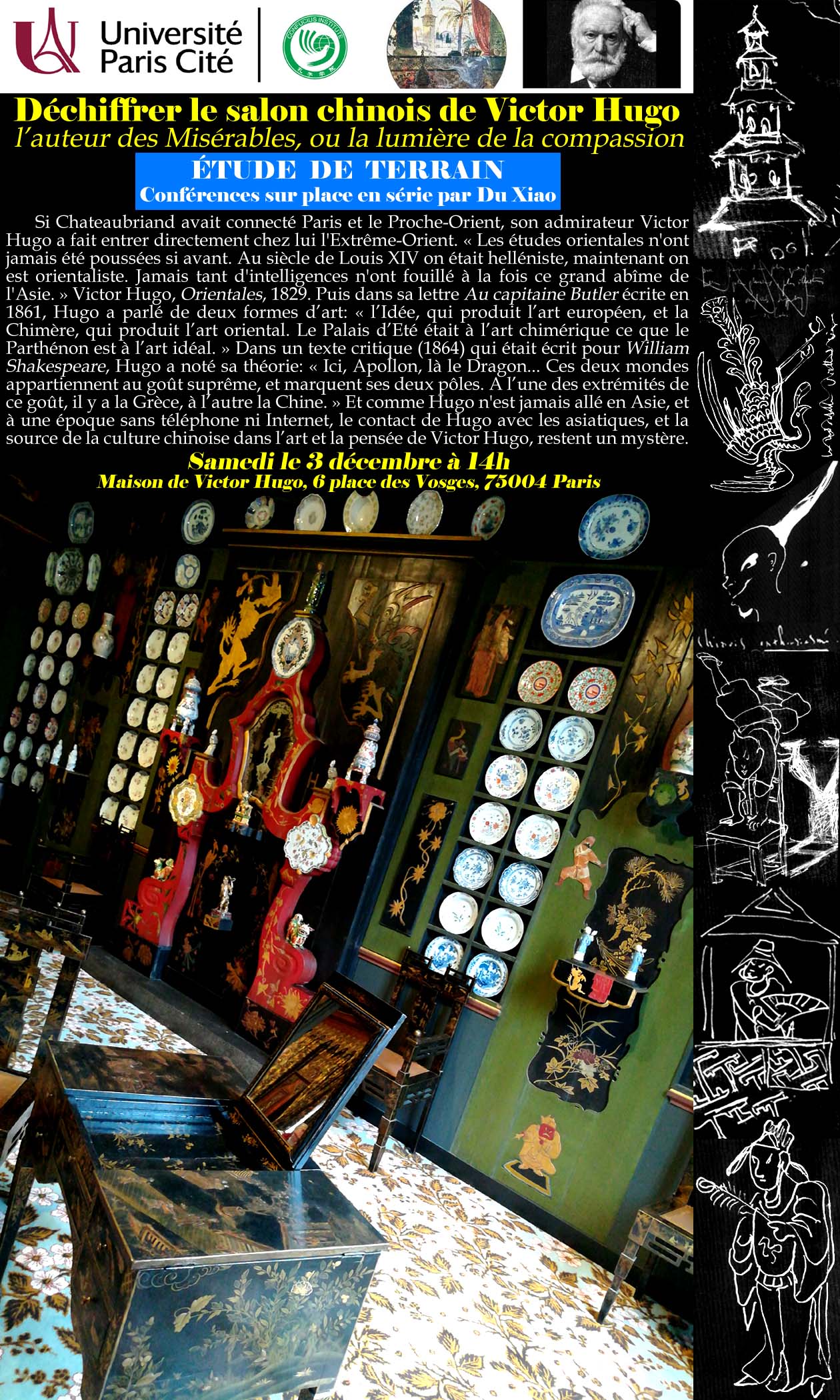 Si Chateaubriand avait connecté Paris et le Proche-Orient, son admirateur Victor Hugo a fait entrer directement chez lui l’Extrême-Orient. « Les études orientales n’ont jamais été poussées si avant. Au siècle de Louis XIV on était helléniste, maintenant on est orientaliste. Jamais tant d’intelligences n’ont fouillé à la fois ce grand abîme de l’Asie. » Victor Hugo, Orientales, 1829. Puis dans sa lettre Au capitaine Butler écrite en 1861, Hugo a parlé de deux formes d’art: « l’Idée, qui produit l’art européen, et la Chimère, qui produit l’art oriental. Le Palais d’Eté était à l’art chimérique ce que le Parthénon est à l’art idéal. » Dans un texte critique (1864) qui était écrit pour William Shakespeare, Hugo a noté sa théorie: « Ici, Apollon, là le Dragon… Ces deux mondes appartiennent au goût suprême, et marquent ses deux pôles. A l’une des extrémités de ce goût, il y a la Grèce, à l’autre la Chine. » Et comme Hugo n’est jamais allé en Asie, et à une époque sans téléphone ni Internet, le contact de Hugo avec les asiatiques, et la source de la culture chinoise dans l’art et la pensée de Victor Hugo, restent un mystère.