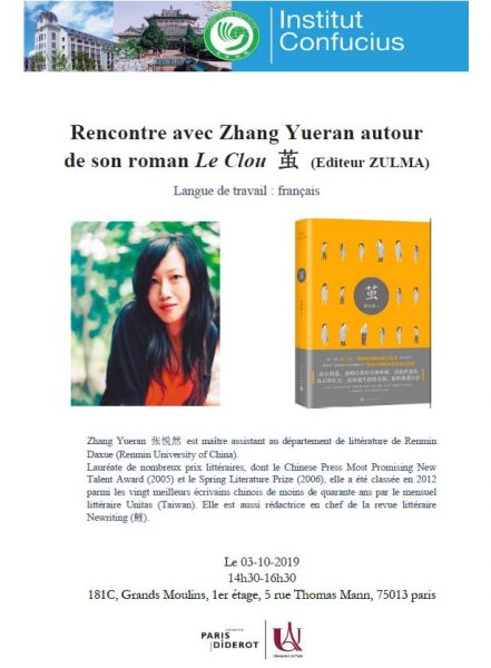 Zhang Yueran 张悦然 est maître assistant au département de littérature de Renmin Daxue (Renmin University of China). Lauréate de nombreux prix littéraires, dont le Chinese Press Most Promising New Talent Award (2005) et le Spring Literature Prize (2006), elle a été classée en 2012 parmi les vingt meilleurs écrivains chinois de moins de quarante ans par le mensuel littéraire Unitas (Taiwan). Elle est aussi rédactrice en chef de la revue littéraire Newriting (鲤).