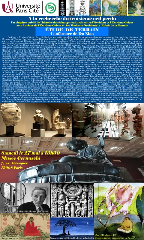 Et ceci est bien le cas de Marcel Duchamp, de multiples témoins historiques l’ont noté et prouvé. Ici, la méthodologie historique est plus pertinente que celle de l’analyse de l’imaginaire panhellénique pour comprendre les œuvres de Duchamp, innovantes à son époque, telles que le « Courant d’air sur un pommier du Japon » (1911) et les fameux « Ready-made » (Chan/Zen). Il circule un préjugé affirmant que l’art d’Asie n’impacte que l’Asie. Si l’art venu de l’Extrême-Orient est clôturé dans les seules barrières de disciplines spécialisées, telles que les études orientalistes,la sinologie, l’indologie, la japonologie… et si les musées consacrés aux arts asiatiques n’intéressent que des orientalistes et spécialistes ? alors, ce serait un grand échec et une grande perte pour l’humanité. Et bien, non, ce n’est pas la réalité. Faisons attention aux inventions des clichés et préjugés…
