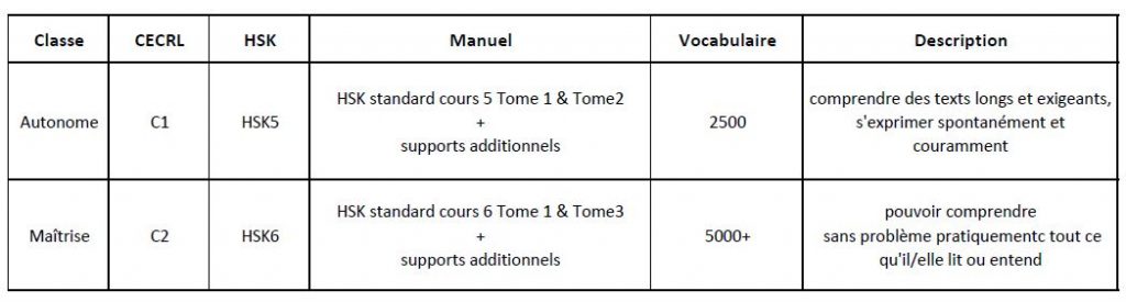 Convient aux apprenants qui ont étudié 480 heures et maîtrisent environ 1500 mots de vocabulaire. Le manuel utilisé est Le cours standard de HSK 5 volume 1 et vous étudierez 8 unités tout au long de l’année. Vous apprendrez environ 320 nouveaux mots et 32 points de grammaire de langue ; vous apprendrez à parler de sujets tels que le mariage et la famille, les légendes chinoises et les histoires idiomatiques, l’histoire et la géographie chinoises ; vous apprendrez les titres de parenté chinois, les titres sociaux, etc. et vous entraînerez votre capacité de l’expression écrite en paragraphes sur la base de discussions de groupe.