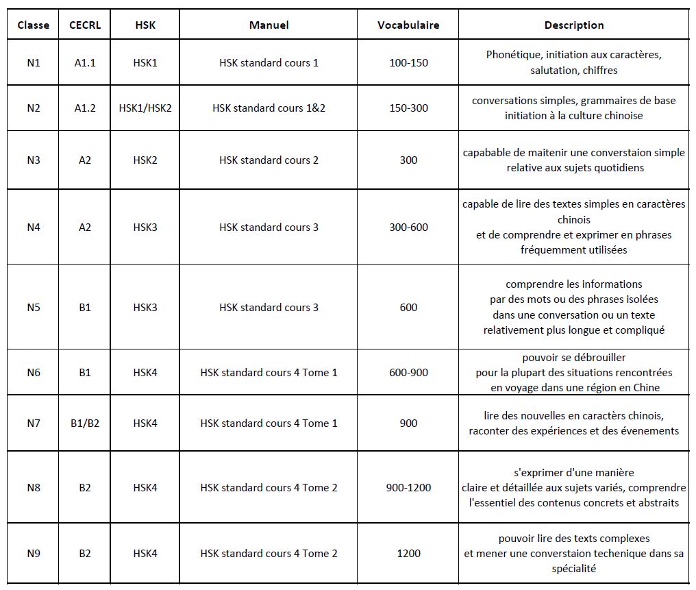 Les manuels sont à votre charge à partir du niveau N2. Vous devez acheter le HSK standard cours ainsi que le cahier d’exercices correspondant à votre niveau.